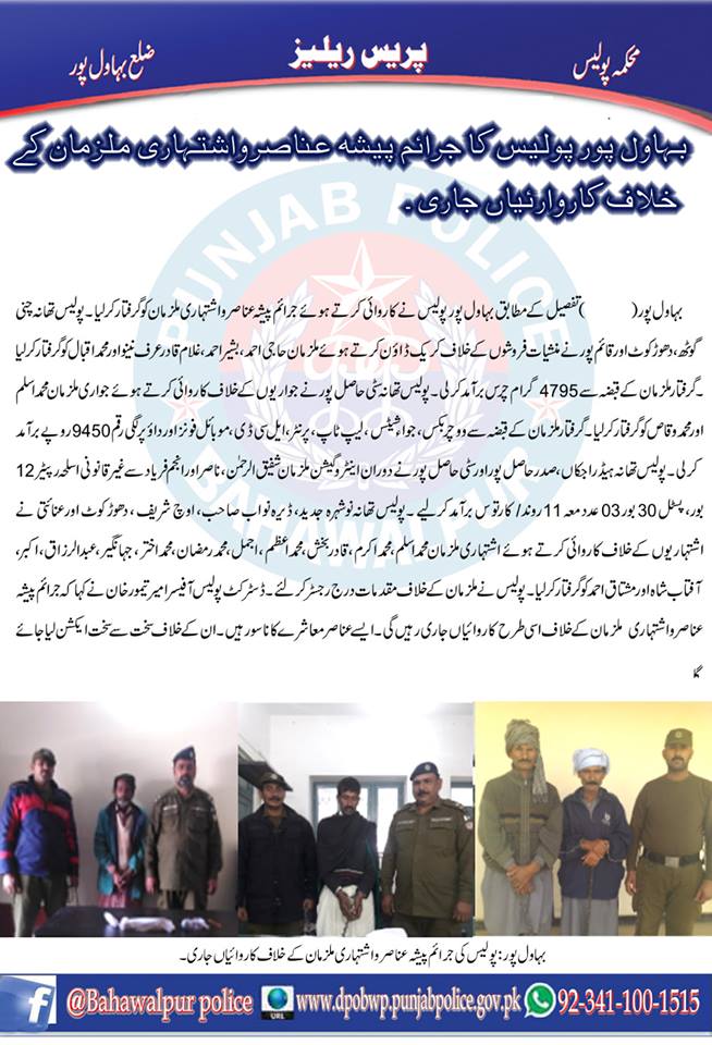 بہاولپور پولیس کا جرائم پیشہ عناصر اور اشتہاری ملزمان کے خلاف کاروائیاں جاری