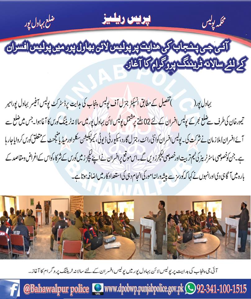 آئی جی پنجاب کی ھدایت پر ڈسٹرکٹ پولیس لائینز بہاولپور میں پولیس آفیسران کے لیے سالانہ ٹرینینگ پروگرام کا آغاز۔