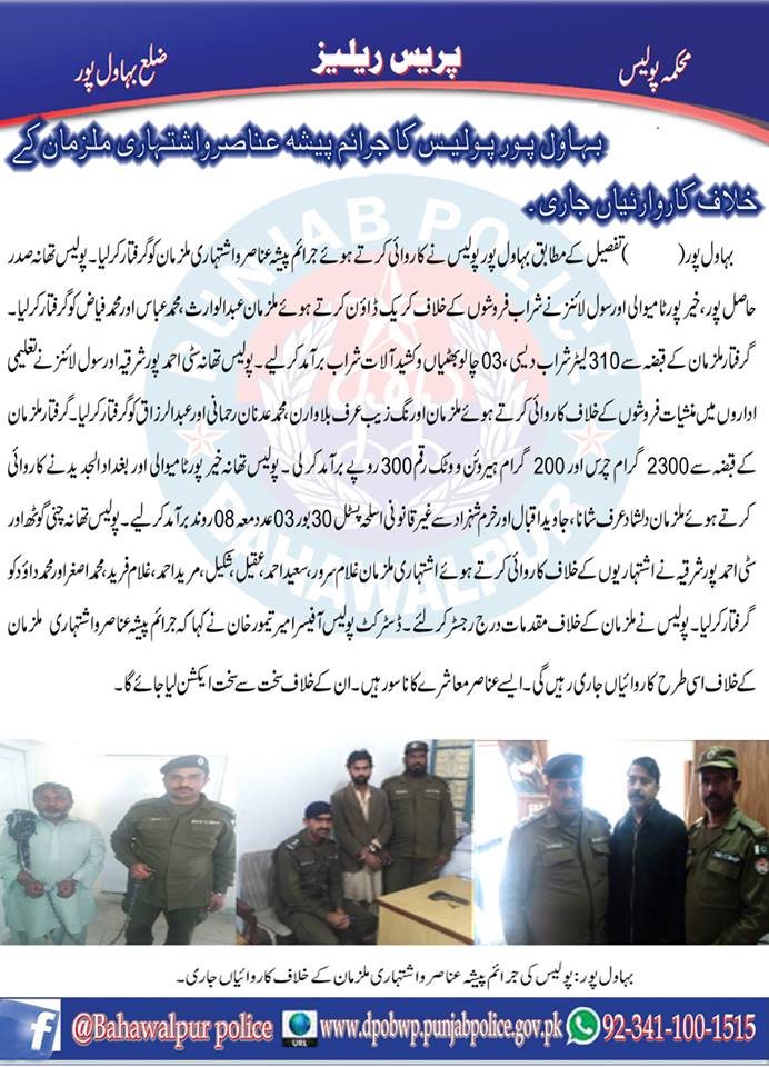 بہاولپور پولیس کا جرائم پیشہ عناصر و اشتہاری ملزمان کے خلاف کاروائیاں جاری۔