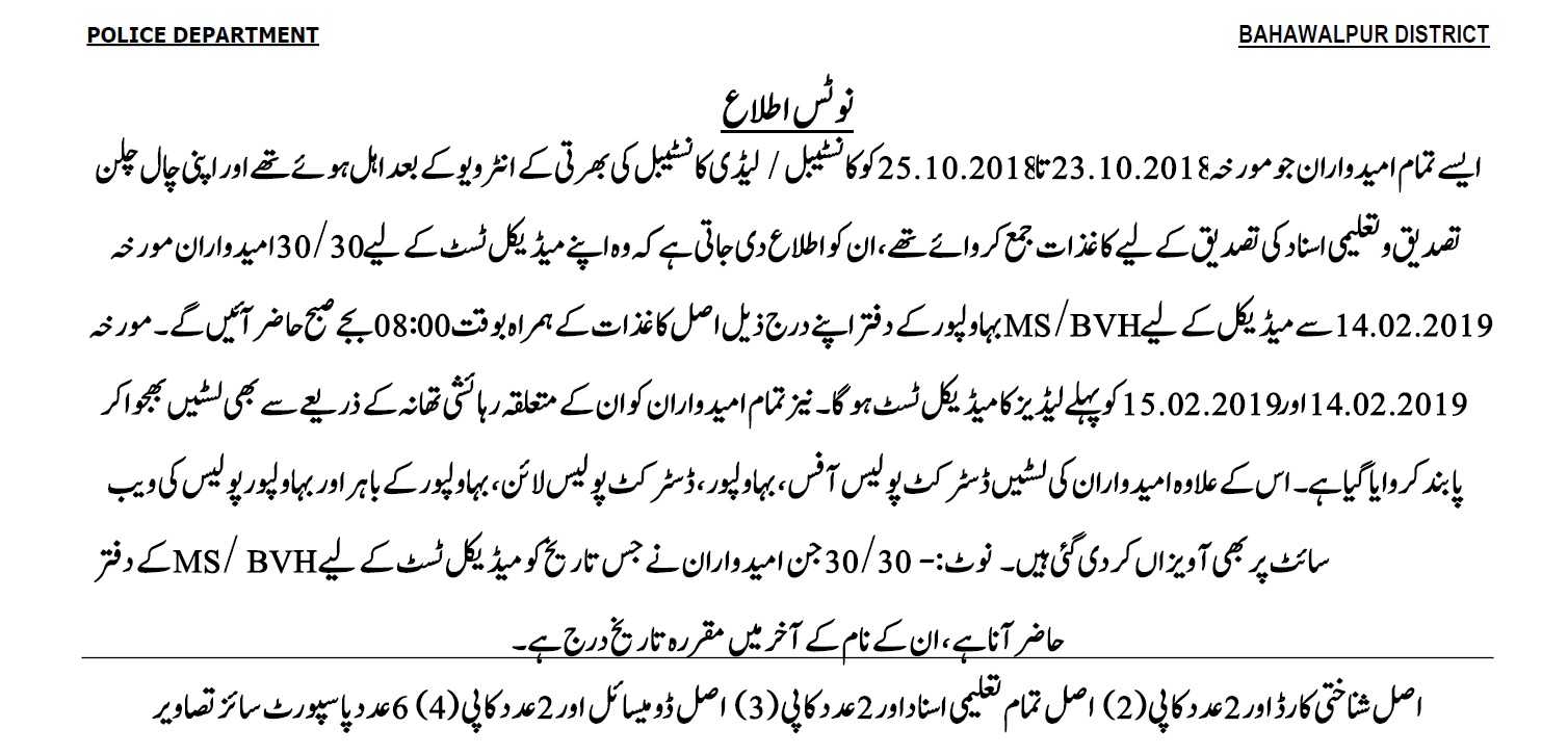 ایسے تمام امیدواران جو مورخہ 23.10.2018 تا 25.10.2018 کو کانسٹیبل / لیڈی کانسٹیبل کی بھرتی کے انٹرویو کے بعد اہل ہوئے تھےاور اپنی چال چلن تصدیق و تعلیمی اسناد کی تصدیق کے لیےکاغذات جمع کروائے تھے ، ان کو اطلاع دی جاتی ہےکہ وہ اپنے میڈیکل ٹسٹ کے لیے 30/30 امیدواران مورخہ 14.02.2019 سے میڈیکل کے لیے ایم ۔ایس / بہاول ویکٹوریہ ہسپتال بہاولپور کے دفتر اپنے درج ذیل اصل کاغذات کے ہمراہ بوقت 08:00 بجے صبح حاضر آئیں گے۔ مورخہ 14.02.2019 اور 15.02.2019 کو پہلے لیڈیز کا میڈیکل ٹسٹ ہو گا۔ نیز تمام امیدواران کو ان کے متعلقہ رہائشی تھانہ کے ذریعے سے بھی لسٹیں بھجواکر پابند کروایا گیا ہے۔ اس کے علاوہ امیدواران کی لسٹیں ڈسٹرکٹ پولیس آفس، بہاولپور، ڈسٹرکٹ پولیس لائن، بہاولپور کے باہر اور بہاولپور پولیس کی ویب سائٹ پر بھی آویزاں کر دی گئی ہیں۔