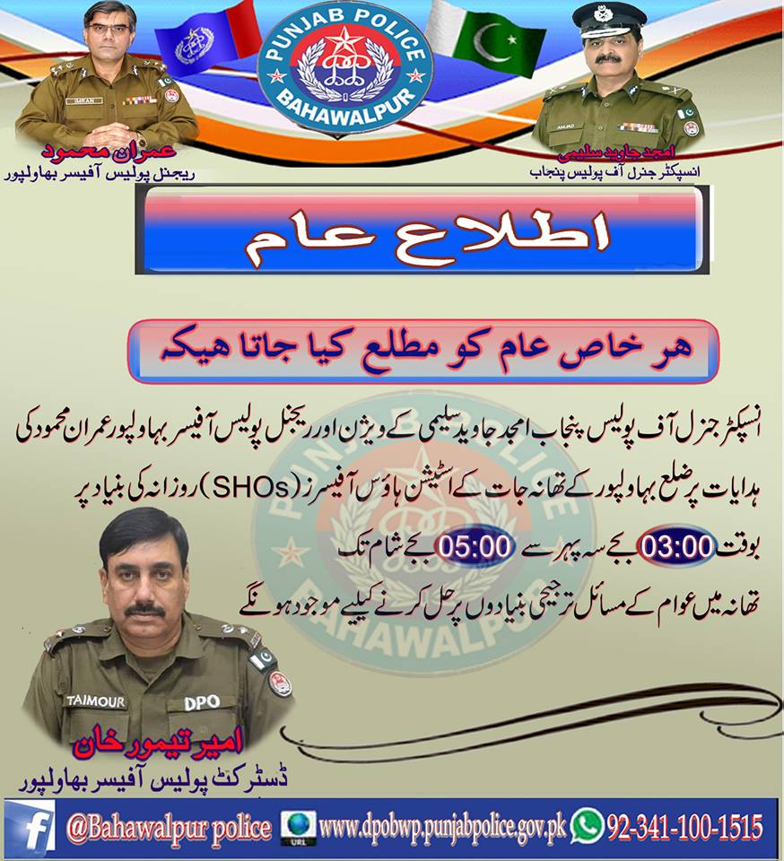 ہر خاص و عام کو مطلع کیاجاتا ھے انسپکٹر جنرل آف پولیس پنجاب امجد جاوید سلیمی کے ویژن اور ریجنل پولیس آفیسر بہاولپور عمران محمود کی ہدایات پر ضلع بہاولپور کے ایس ایچ اوز تھانہ روزانہ کی بنیاد پر