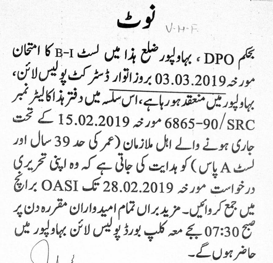 ضلع بہاولپور پولیس میں لسٹ بی-ون کاامتحان مورخہ 03مارچ 2019ء بروزاتوار ڈسٹرکٹ پولیس لائن بہاولپور میں منعقدکیاجارہاھے اس سلسلے میں دفتر ایس آر سی برانچ سے جاری ہونے والے اہل ملازمان پولیس(عمر کی حد 39 سال اور لسٹ اے پاس شدہ) کو ہدایت کی جاتی ھیکہ وہ اپنی تحریری درخوست مورخہ 28فروی 2019ء تک OASIبرانچ جمع کروائیں تمام امیدواران بمطابق لسٹ مقررہ دن صبح7:30 بجے پولیس لائینز بہاولپور حاضر آئیں گے۔