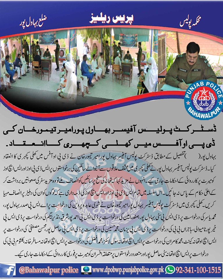 ڈسٹرکٹ پولیس آفیسر بہاولپور امیر تیمور خان کا ضلعی پولیس دفتر بہاولپور میں کھلی کچہری کاانعقاد ،مختلف علاقوں سے آنے والے سائلین کی درخواستوں پرایس ڈی پی اوز اور ایس ایچ اوز کو میرٹ پر کاروائی کے احکامات جاری۔