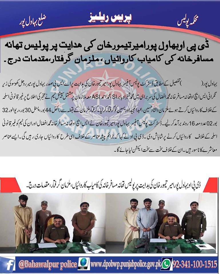 ڈسٹرکٹ پولیس آفیسر بہاولپور امیر تیمور خان کی ھدایت پر پولیس تھانہ مسافرخانہ کی کامیاب کاروائی ملزمان گرفتار مقدمات درج۔