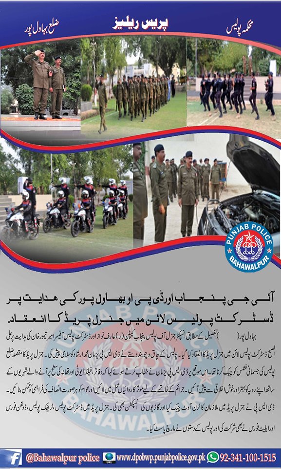 انسپکٹر جنرل آف پولیس پنجاب کیپٹن(ریٹائرڈ )عارف نواز اور ڈسٹرکٹ پولیس آفیسر بہاولپور امیر تیمور خان کی ہدایت پر ڈسٹرکٹ پولیس لائینز بہاولپور میں جنرل پریڈ کا انعقاد کیا گیا، پولیس کے چاک و چوبند دَستوں نے محمد ارشاد جوئیہ ڈی ایس پی یزمان سرکل کو سلامی پیش کی اور مارچ پاسٹ کیا بعد ازاں محمد ارشاد جوئیہ ڈی ایس پی یزمان سرکل نے ڈسٹرکٹ پولیس لائینز گاڑیوں کی انسپکشن کی اور مناسب ہدایات جاری کی۔