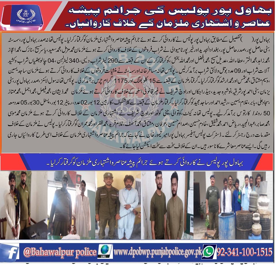 بہاولپور پولیس کا جرائم پیشہ عناصر و اشتہاری ملزمان کے خلاف کاروائیاں جاری