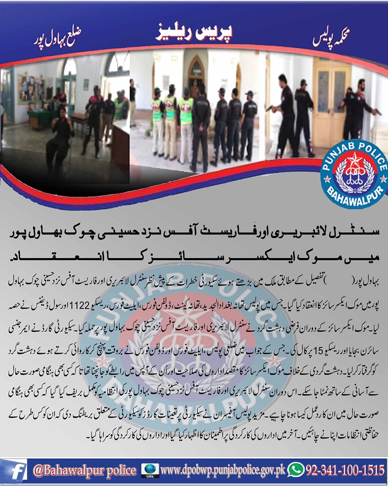ملک میں سکیورٹی خطرات کے پیش نظر بہاولپور پولیس کا سنٹل لائیبریری بہاولپور اور فاریسٹ دفتر بہاولپور پر موک ایکسرسائز کا انعقاد ۔