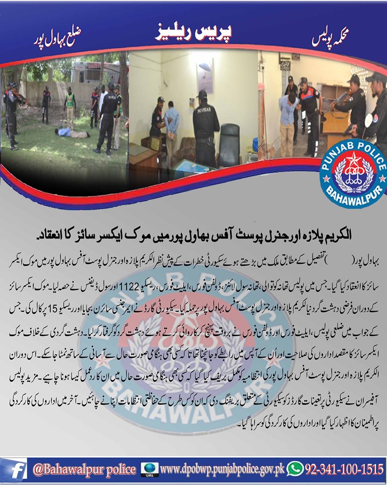 ملک میں سکیورٹی خطرات کے پیش نظر بہاولپور پولیس کا الکریم پلازہ سرکلر روڈ بہاولپور اور پوسٹ آفس بہاولپور پر موک ایکسرسائز کا انعقاد ۔
