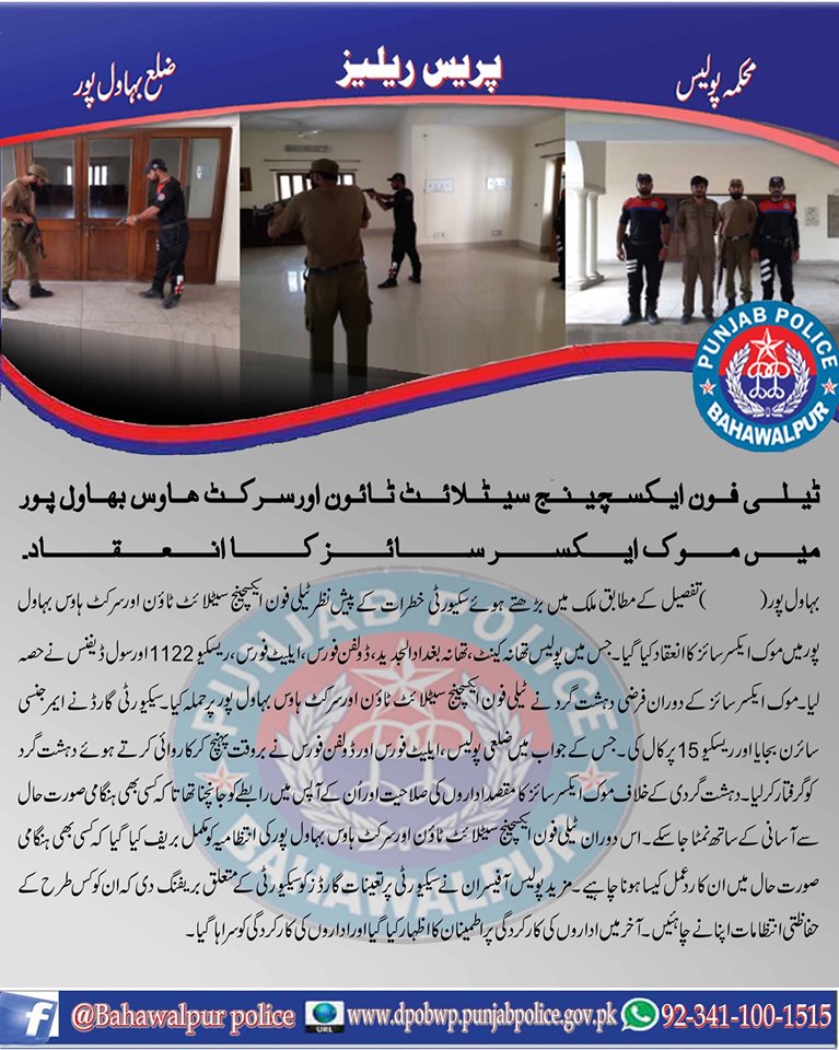 ملک میں سکیورٹی خطرات کے پیش نظر بہاولپور پولیس کا ٹیلیفون ایکسچینج سٹلائیٹ ٹاؤن بہاولپور اور سرکٹ ہاؤس بہاولپور پر موک ایکسرسائز کا انعقاد ۔