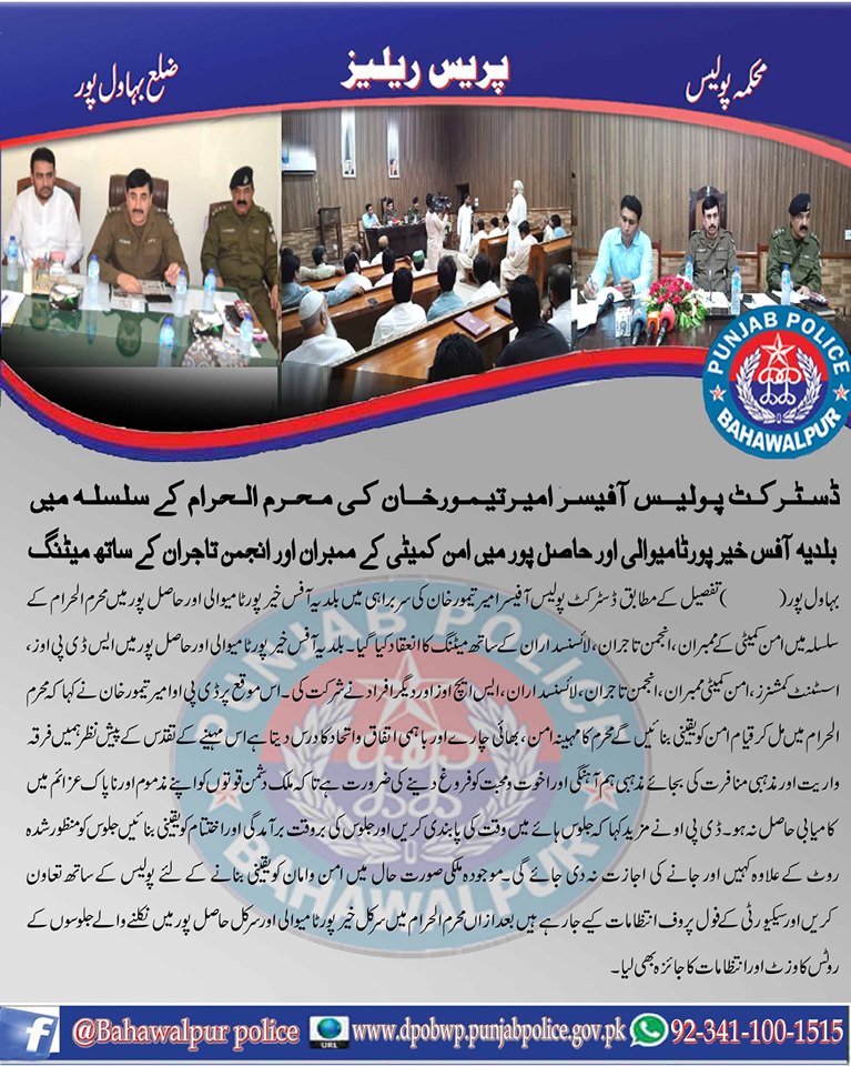 ڈسٹرکٹ پولیس آفیسر بہاولپور امیر تیمور خان کی محرم الحرام کے سلسلے میں سرکل خیرپور ٹامیوالی اور سرکل حاصلپور میں انجمن تاجران اور امن کمیٹی کے ممبران کے ساتھ میٹنگ