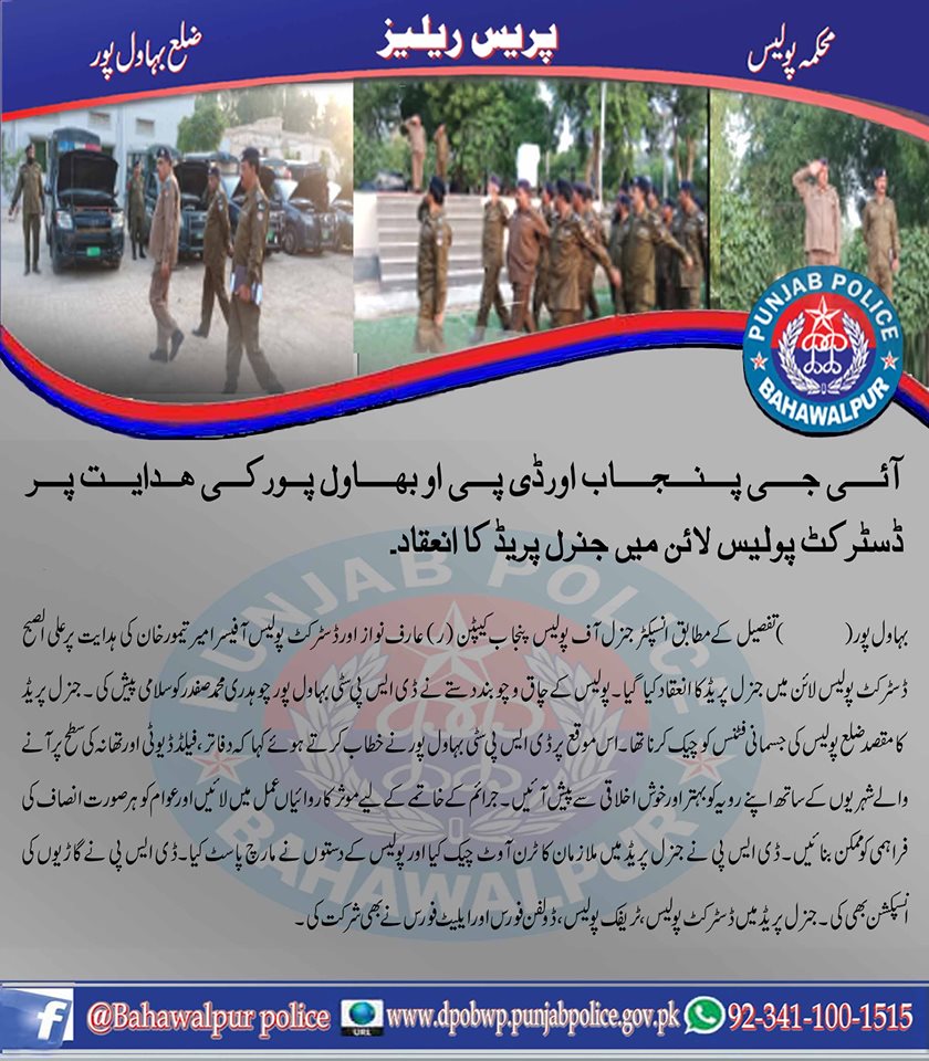 انسپکٹر جنرل آف پنجاب پولیس اور ڈسٹرکٹ پولیس آفیسر بہاولپور کی ہدایت پر ڈسٹرکٹ پولیس لائینز میں جنرل پریڈ کا انعقاد ۔