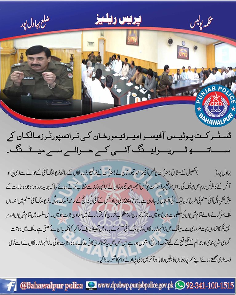 ڈسٹرکٹ پولیس آفیسر بہاولپور امیر تیمور خان کی ٹرانسپورٹرز مالکان کے ساتھ ٹریولنگ آئی کے حوالے سے میٹنگ ۔