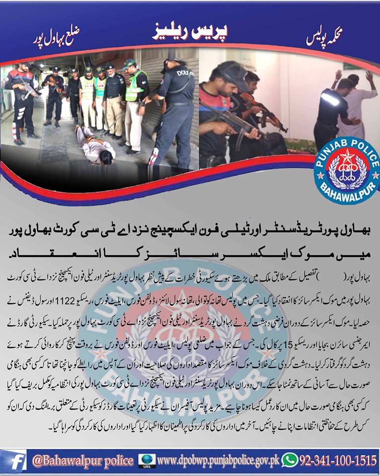 ملک میں سکیورٹی خطرات کے پیش نظر بہاولپور پولیس کا ٹریڈ سنٹرز بہاولپور اور ٹیلیفون ایکسچینج نزد اےٹی سی کورٹ بہاولپور پر موک ایکسرسائز کا انعقاد ۔