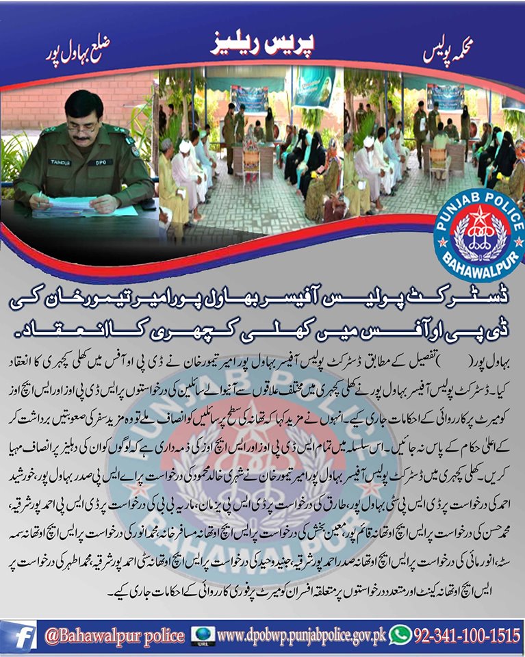 ڈسٹرکٹ پولیس آفیسر بہاولپور امیر تیمور خان کا ضلعی پولیس دفتر بہاولپور میں کھلی کچہری کاانعقاد ،مختلف علاقوں سے آنے والے سائلین کی درخواستوں پرایس ڈی پی اوز اور ایس ایچ اوز کو میرٹ پر کاروائی کے احکامات جاری۔