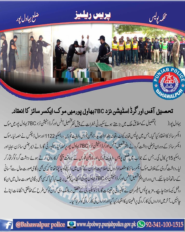ملک میں سکیورٹی خطرات کے پیش نظر بہاولپور پولیس کا تحصيل دفتر بہاولپور اور گریڈ اسٹیشن بہاولپور پر موک ایکسرسائز کا انعقاد ۔