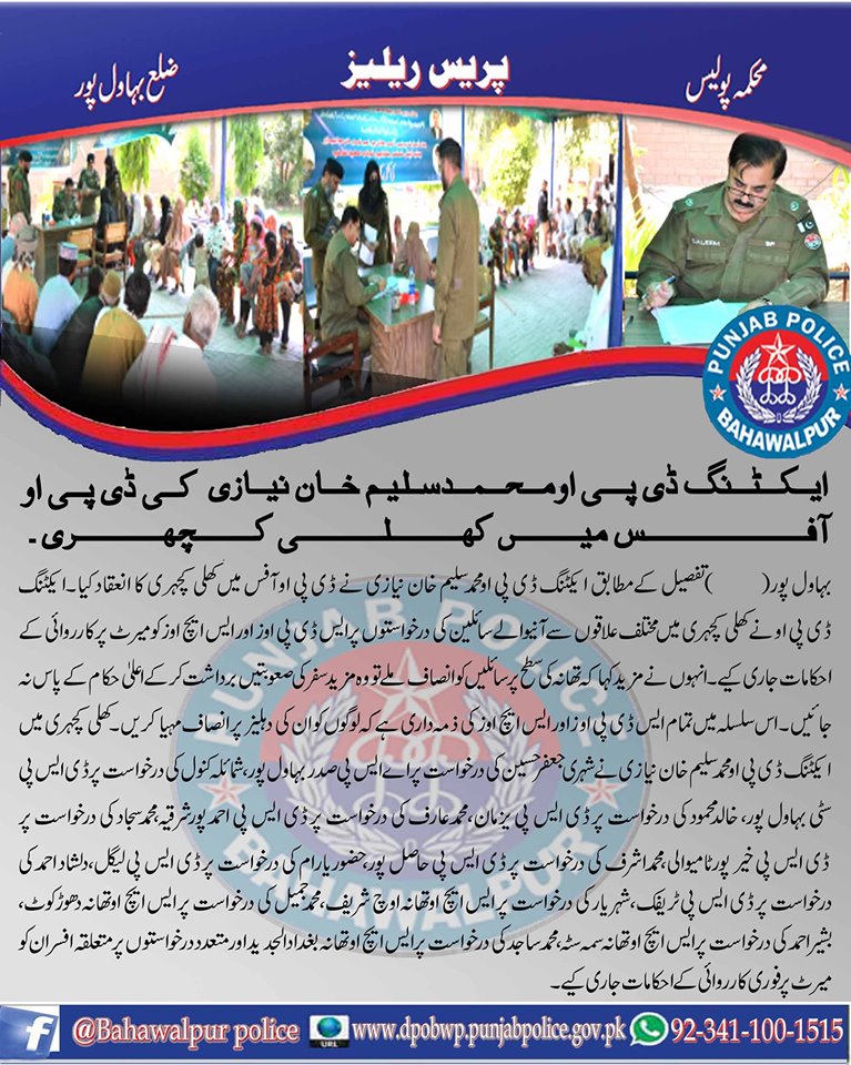 ایکٹنگ ڈسٹرکٹ پولیس آفیسر بہاولپور محمد سلیم خان نیازی کا ضلعی پولیس دفتر بہاولپور میں کھلی کچہری کاانعقاد ،مختلف علاقوں سے آنے والے سائلین کی درخواستوں پرایس ڈی پی اوز اور ایس ایچ اوز کو میرٹ پر کاروائی کے احکامات جاری۔