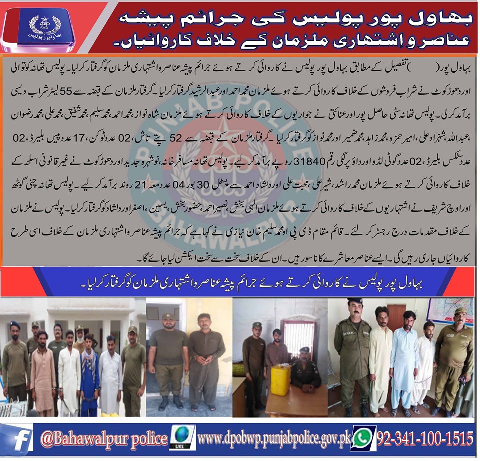 بہاولپور پولیس کا جرائم پیشہ عناصر و اشتہاری ملزمان کے خلاف کاروائیاں جاری