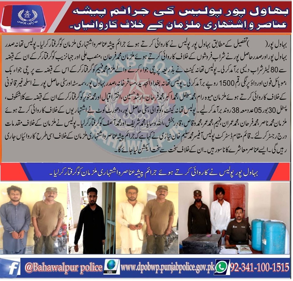 بہاولپور پولیس کا جرائم پیشہ عناصر و اشتہاری ملزمان کے خلاف کاروائیاں جاری