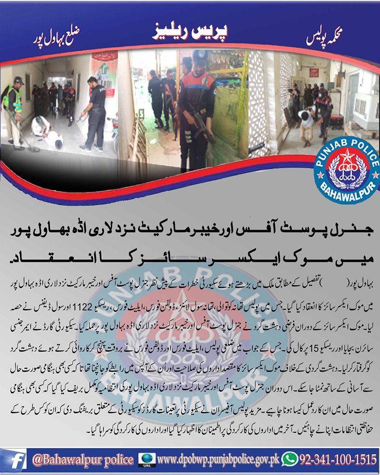 ملک میں سکیورٹی خطرات کے پیش نظر بہاولپور پولیس کا جنرل پوسٹ آفس بہاولپور اور خیبرمارکیٹ لاری اڈہ بہاولپور پر موک ایکسرسائز کا انعقاد ۔