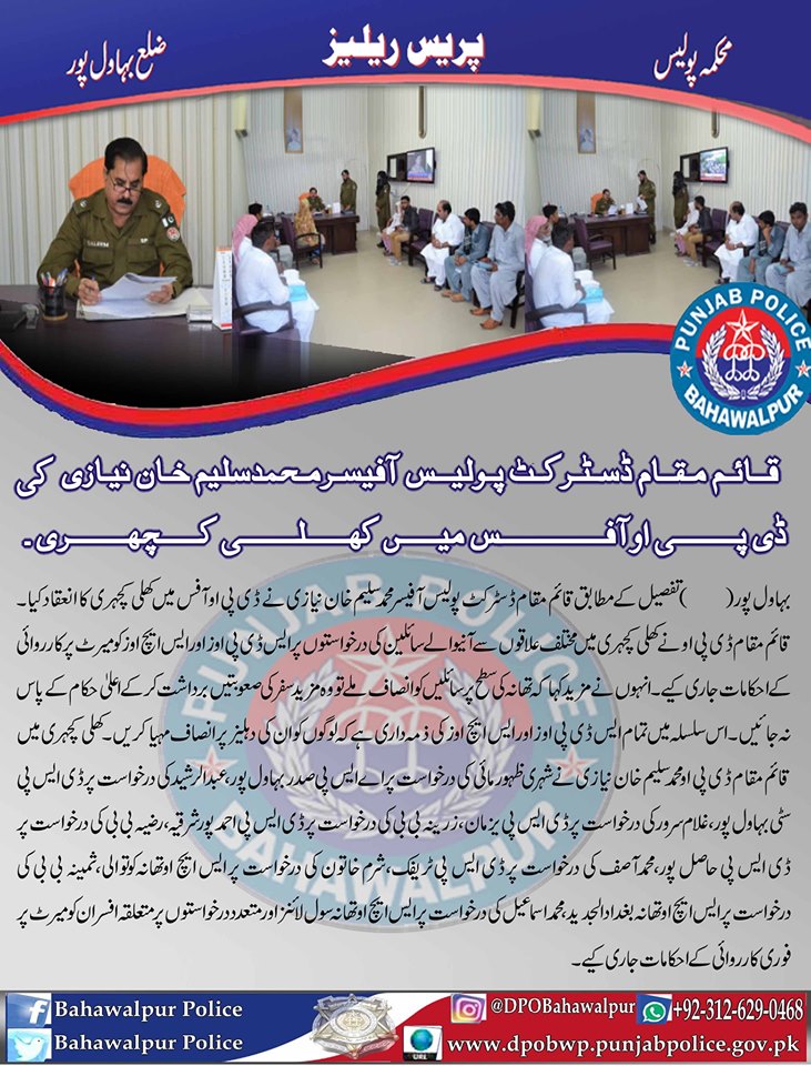 قائم مقام ڈسٹرکٹ پولیس آفیسر بہاولپور محمد سلیم خان نیازی کا ضلعی پولیس دفتر بہاولپور میں کھلی کچہری کاانعقاد ،مختلف علاقوں سے آنے والے سائلین کی درخواستوں پرایس ڈی پی اوز اور ایس ایچ اوز کو میرٹ پر کاروائی کے احکامات جاری۔