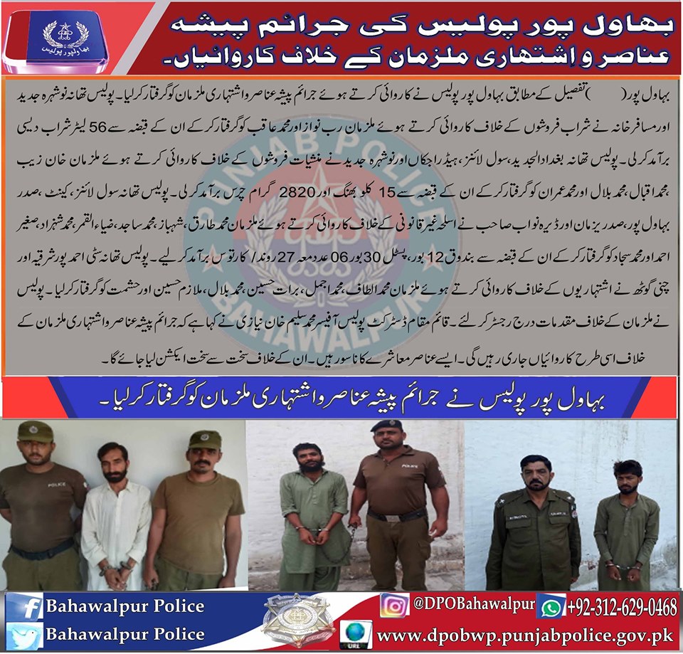 بہاولپور پولیس کا جرائم پیشہ عناصر و اشتہاری ملزمان کے خلاف کاروائیاں جاری