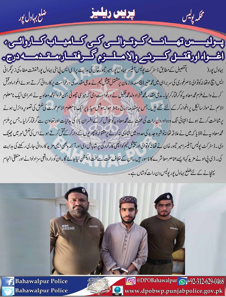 پولیس تھانہ کوتوالی بہاولپور کی کامیاب کاروائی ،فروہ شکیل نامی خاتون کواغواء کر کے قتل کرنے والا ملزم گرفتار ۔