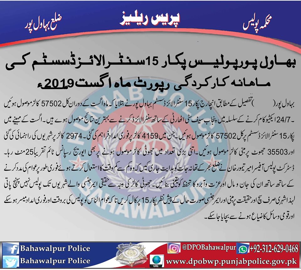 بہاولپور پولیس پکار 15 سنٹرلائزڈ سسٹم کی ماہانہ کرکردگی رپورٹ جاری ،ماہ اگست 2019ء میں کل 57,502 کالز موصول ہوئیں 4159 کالزپر فوری امداد فراھم کی گئی ۔