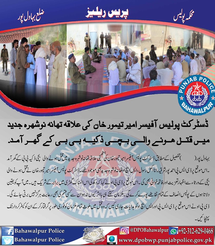 ڈسٹرکٹ پولیس آفیسر بہاولپور امیر تیمور خان کی علاقہ تھانہ نوشہرہ الجدید میں قتل ہونے والی بچی ذکیہ بی بی کے گھرآمد،قتل کےملزمان کو گرفتار کرکے کیفرکردار تک پہنچائیں،ڈی ایس پی سرکل احمدپورشرقیہ و ایس ایچ او کو ہدایت جاری۔