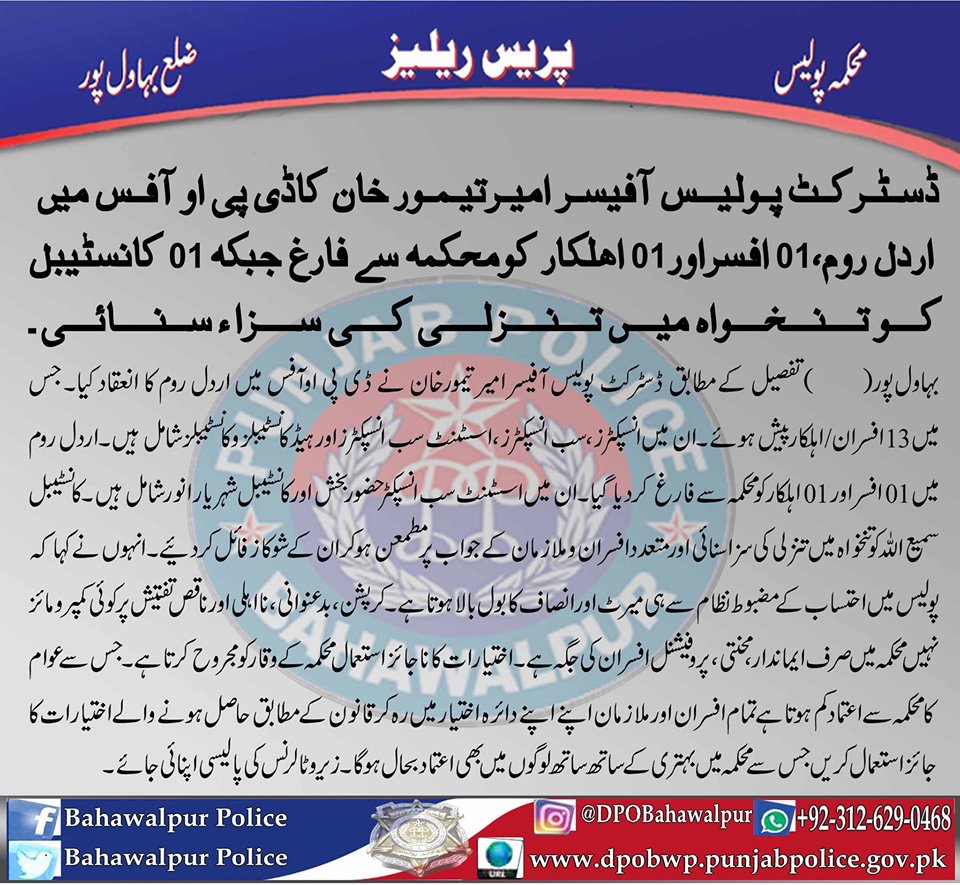 ڈسٹرکٹ پوکیس آفیسر بہاولپور امیر تیمور خان کا ڈسٹرکٹ پولیس دفتر بہاولپور میں اردل روم ، ایک افسر اوار ایک اہلکار کو محکمہ سے فارغ جبکہ ایک کانسٹیل کو تنخواہ میں تنزلی کی سزا سنائی۔