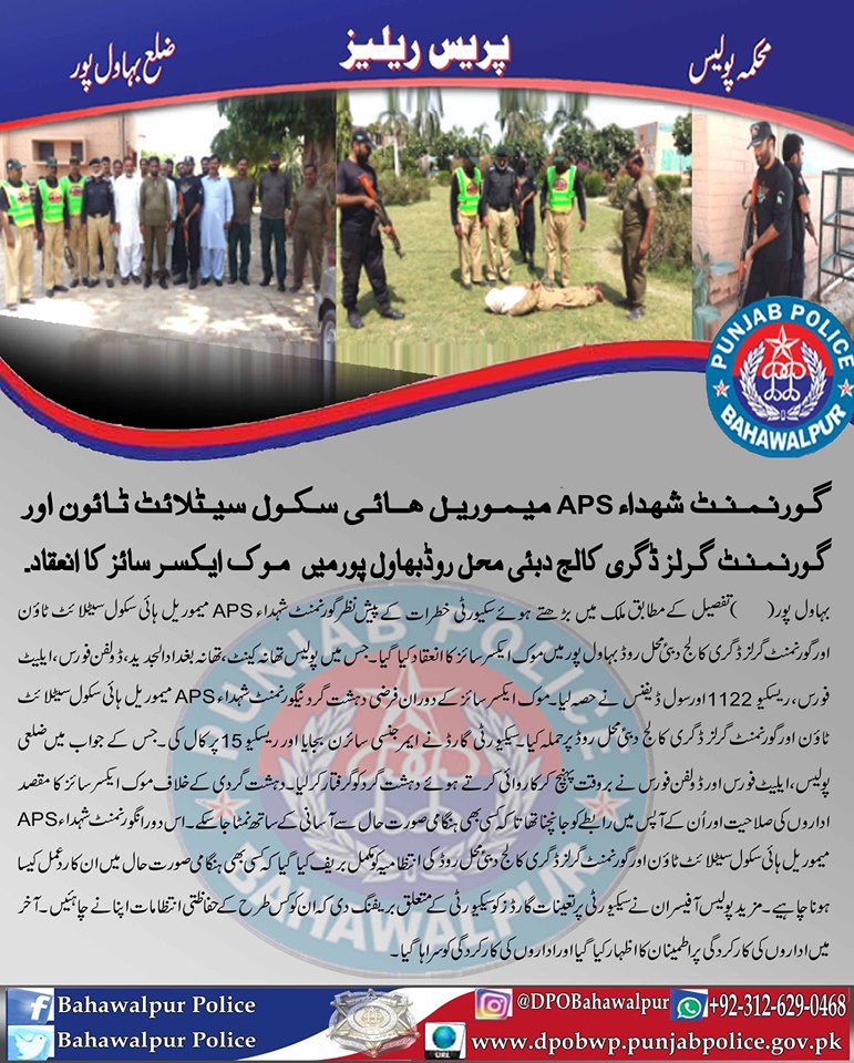 ملک میں سکیورٹی خطرات کے پیش نظر بہاولپور پولیس کا گورشہداء اے۔پی۔ایس میموریل ھائی اسکول سیٹلائٹ ٹاؤن بہاولپور اور گورنمنٹ گرلز ڈگری کالج دبئی محل روڈ بہاولپورپر موک ایکسرسائز کا انعقاد ۔