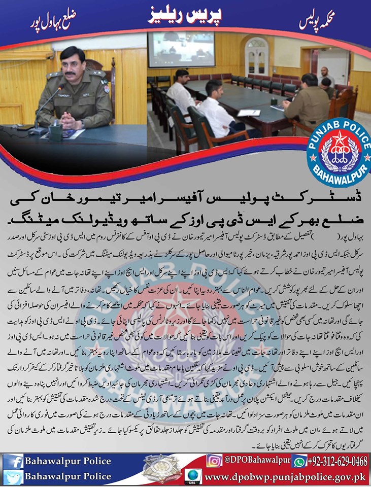 ڈسٹرکٹ پولیس آفیسر امیر تیمور خان کی ضلع بھر کے ایس ڈی پی اوز کے ساتھ ویڈیو لنک میٹنگ
