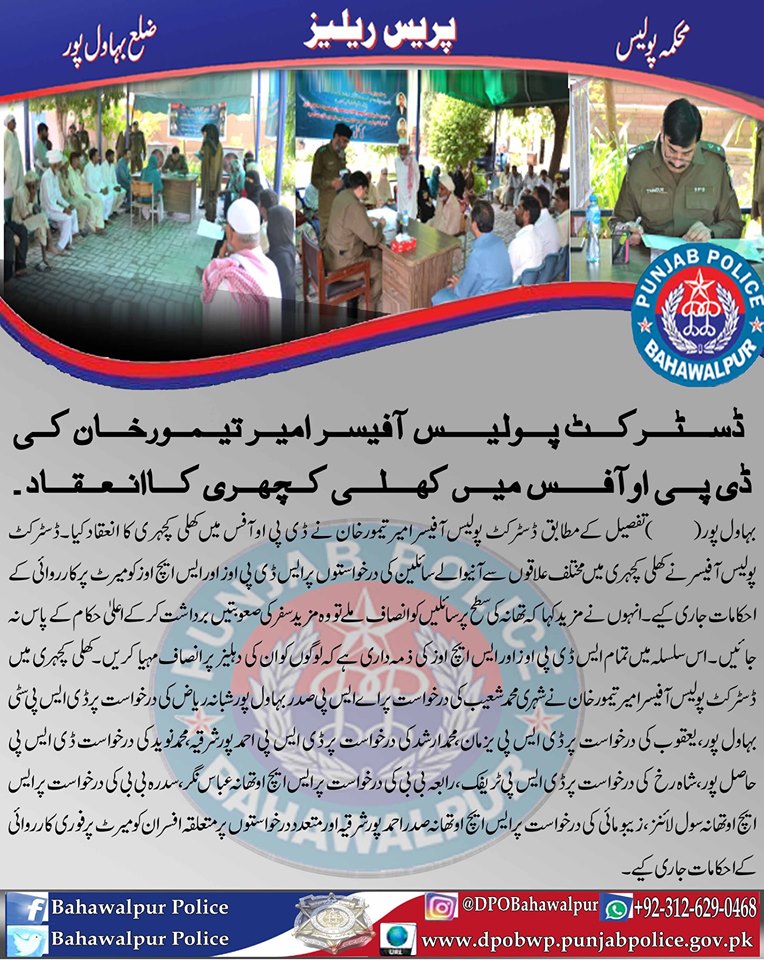 ڈسٹرکٹ پولیس آفیسر بہاولپور امیر تیمور خان کا ضلعی پولیس دفتر بہاولپور میں کھلی کچہری کاانعقاد ،مختلف علاقوں سے آنے والے سائلین کی درخواستوں پرایس ڈی پی اوز اور ایس ایچ اوز کو میرٹ پر کاروائی کے احکامات جاری