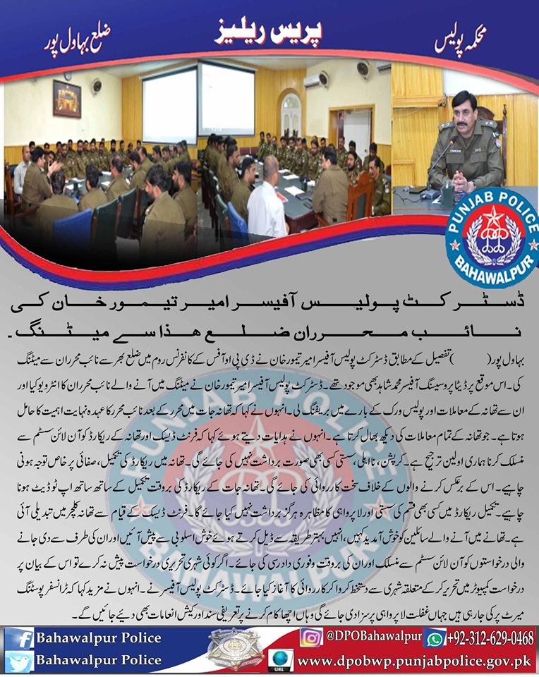 ڈسٹرکٹ پولیس آفیسر بہاولپور امیر تیمور خان کی نائب محرران ضلع ھذا سے میٹنگ ، اس موقع پر ڈیٹا پروسیسنگ آفیسر محمد شاہد ہمراہ موجود
