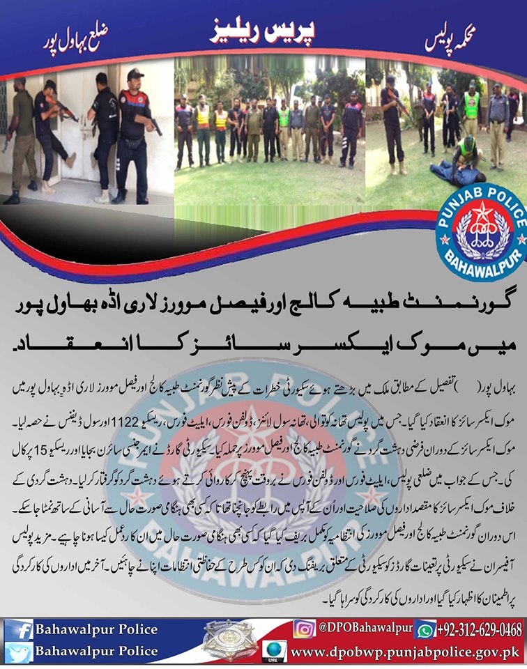 ملک میں سکیورٹی خطرات کے پیش نظر بہاولپور پولیس کا گورنمنٹ طبیہ کالج بہاولپور فیصل موورز لاری اڈہ بہاولپورپر موک ایکسرسائز کا انعقاد ۔