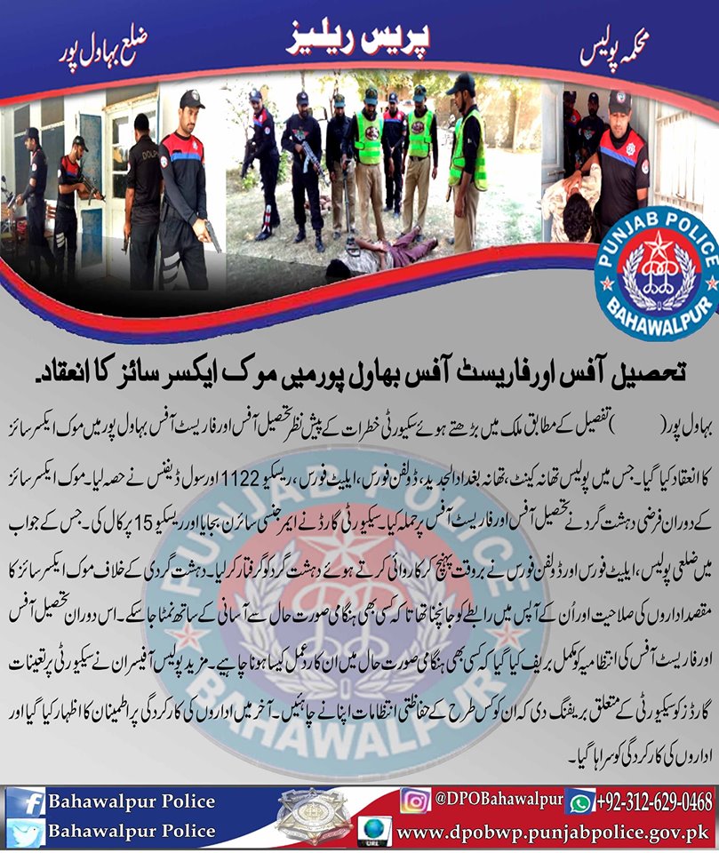 ملک میں سکیورٹی خطرات کے پیش نظر بہاولپور پولیس کا تحصيل آفس بہاولپور فارایسٹ آفس بہاولپورپر موک ایکسرسائز کا انعقاد ۔