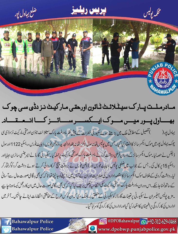 ملک میں سکیورٹی خطرات کے پیش نظر بہاولپور پولیس کامادرِ ملت پارک سیٹلائٹ ٹاؤن بہاولپور اور حقی مارکیٹ نز ڈی سی آفس چوک بہاولپور پر موک ایکسرسائز کا انعقاد ۔