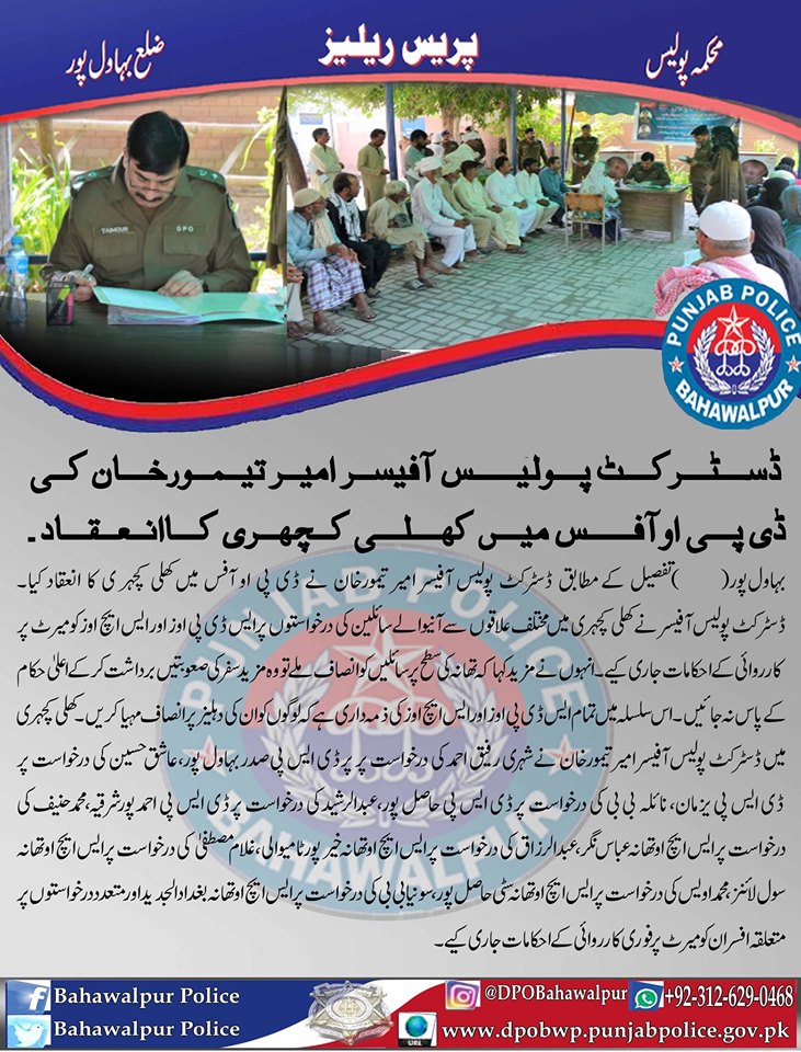 ڈسٹرکٹ پولیس آفیسر بہاولپور امیر تیمور خان کی ڈی پی او آفس میں کھلی کہچری کا انعقاد ، کھلی کہچری میں مختلف علاقوں سے آنے والے سائلین کی درخواستوں پر ایس ڈی پی اوز اور ایس ایچ اوز کو میرٹ پر کاروائی کے احکامات جاری