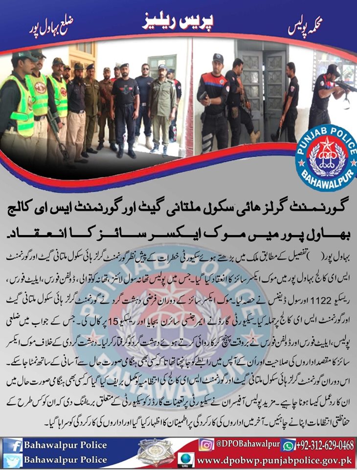 ملک میں سکیورٹی خطرات کے پیش نظر بہاولپور پولیس کا گورنمنٹ گرلزھائی اسکول ملتانی گیٹ بہاولپور اور ایس ای کالج بہاولپور پر موک ایکسرسائز کا انعقاد ۔