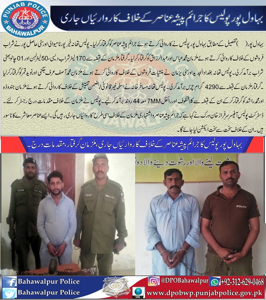 بہاولپور پولیس کی جرائم پیشہ عناصر و اشتہاری ملزمان کے خلاف کاروائیاں جاری