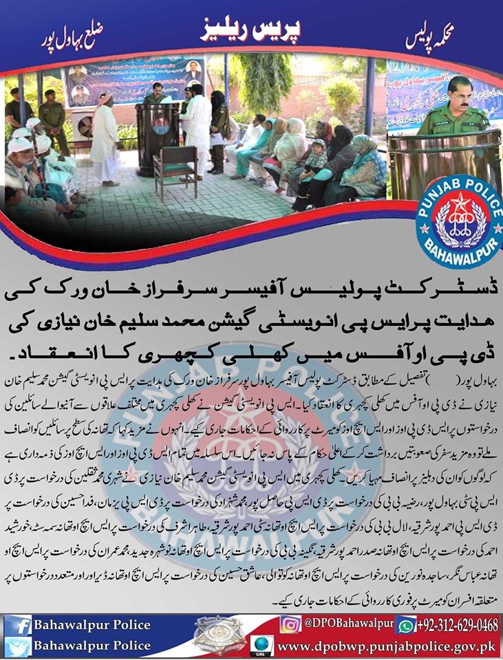 ڈسٹرکٹ پولیس آفیسر سرفراز خان وِرک کی ہدایت پر ایس پی اینوسٹی گیشن محمد سلیم خان نیازی کا ڈی پی او آفس میں کھلی کہچری کا انعقاد ، کھلی کہچری میں مختلف علاقوں سے آنے والے سائلین کی درخواستوں پر ایس ڈی پی اوز اور ایس ایچ اوز کو میرٹ پر کاروائی کے احکامات جا
