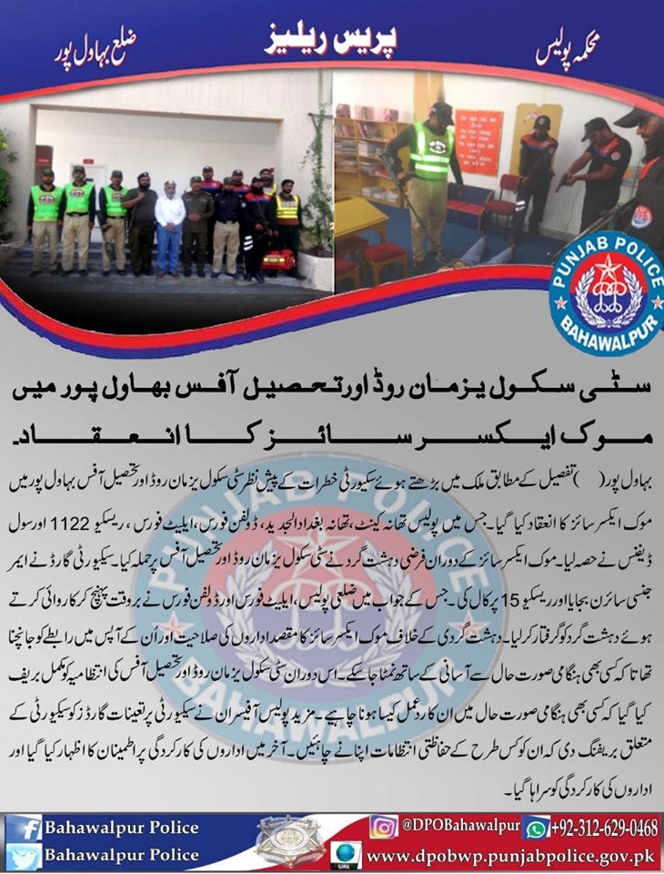 ملک میں سکیورٹی خطرات کے پیش نظر بہاولپور پولیس کا سٹی اسکول یزمان روڈ بہاولپور اور تحصيل آفس بہاولپور پر موک ایکسرسائز کا انعقاد ۔