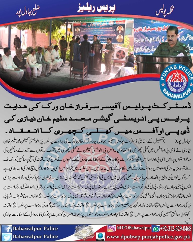 ڈسٹرکٹ پولیس آفیسر سرفراز خان وِرک کی ہدایت پر ایس پی اینوسٹی گیشن محمد سلیم خان نیازی کا ڈی پی او آفس میں کھلی کہچری کا انعقاد ، کھلی کہچری میں مختلف علاقوں سے آنے والے سائلین کی درخواستوں پر ایس ڈی پی اوز اور ایس ایچ اوز کو میرٹ پر کاروائی کے احکامات جا