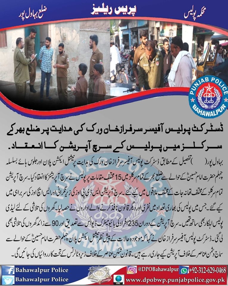 ڈسٹرکٹ پولیس آفیسر سرفراز خان وِرک کی ہدایت پرنیشنل ایکشن پلان کے تحت بہاولپور پولیس کا مختلف علاقوں میں سرچ آپریشن ۔