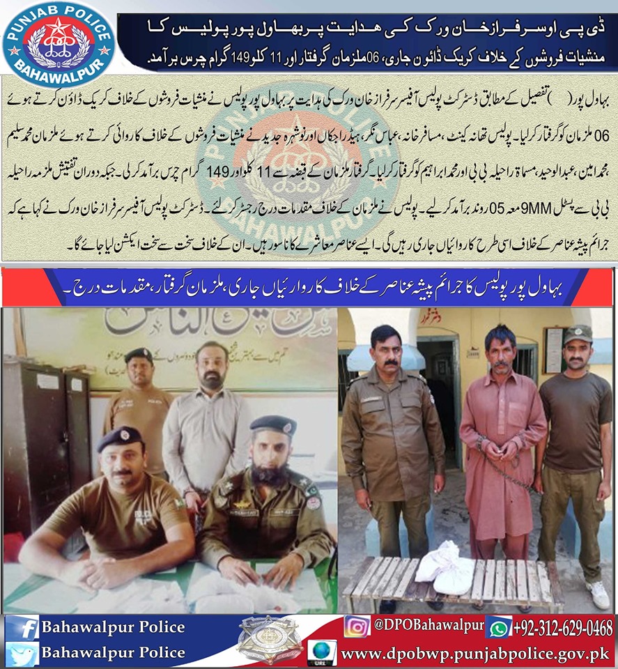 ڈسٹرکٹ پولیس آفیسر سرفراز خان ورک کی ہدایت پر بہاولپور پولیس کا منشیات فروشوں کے خلاف کریک ڈاؤن جاری 06 ملزمان گرفتار اور 11کلو 149گرام چرس برآمد ،مقدمات درج