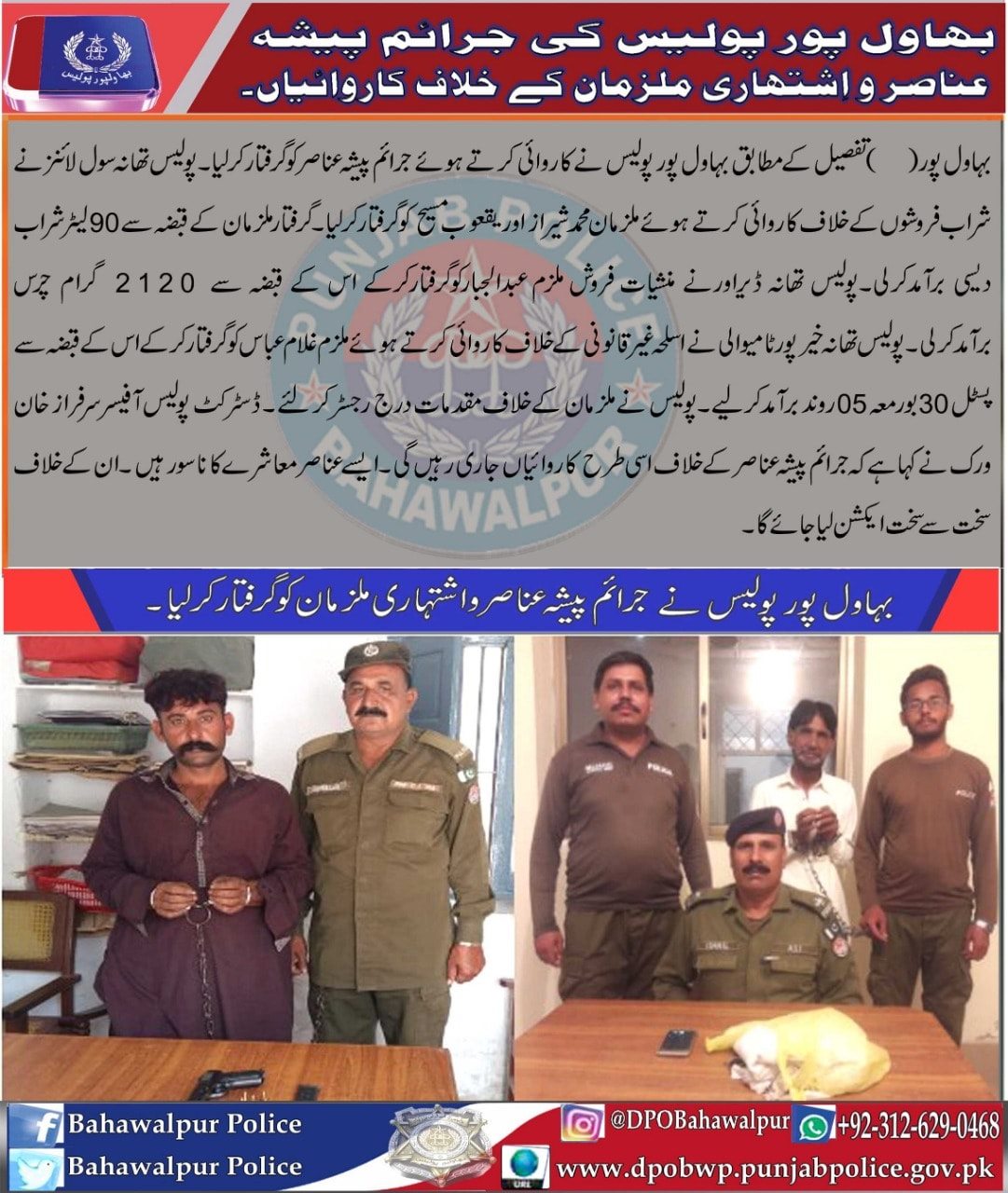 بہاولپور پولیس کی جرائم پیشہ عناصر و اشتہاری ملزمان کے خلاف کاروائیاں جاری