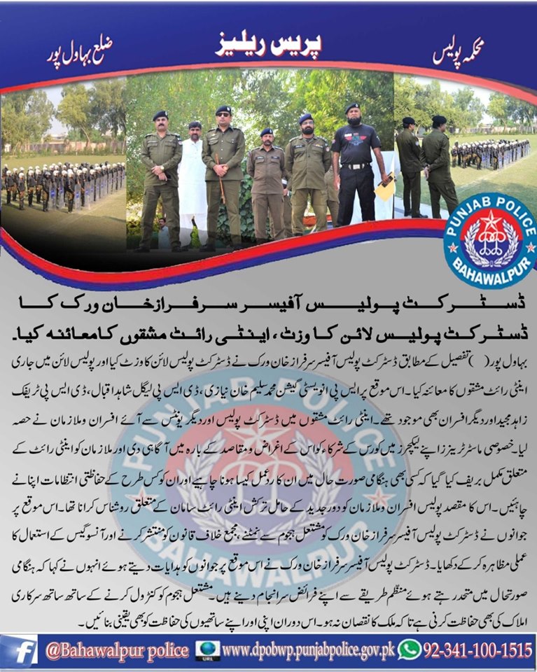 ڈسٹرکٹ پولیس آفیسر سرفراز خان وِرک کا ڈسٹرکٹ پولیس لائینز بہاولپور کا وزٹ،اینٹی رائٹ مشقوں کا معائنہ کیا۔