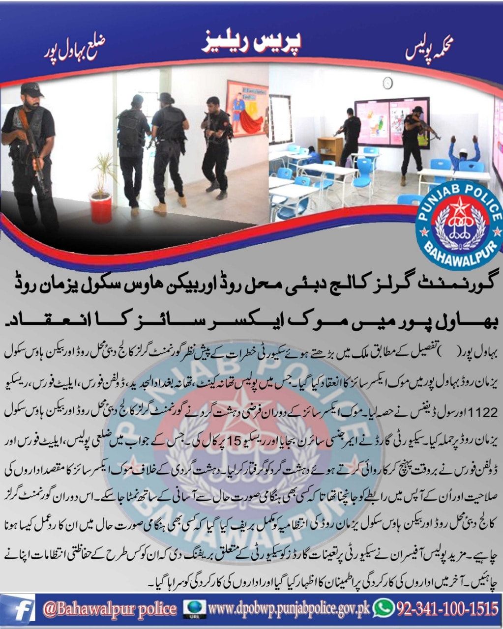 ملک میں سکیورٹی خطرات کے پیش نظر بہاولپور پولیس کا گورنمنٹ گرلزکالج دبئی محل روڈ بہاولپور اور بیکن ہاؤس اسکول یزمان روڈ بہاولپور پر موک ایکسرسائز کا انعقاد ۔