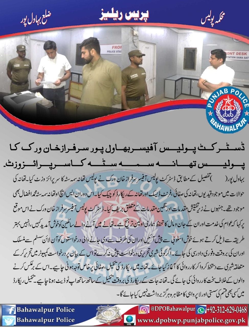 ڈسٹرکٹ پولیس آفیسر سرفراز خان وِرک کا پولیس اسٹیشن سمہ سٹھہ بہاولپور کا سرپرائز وزٹ