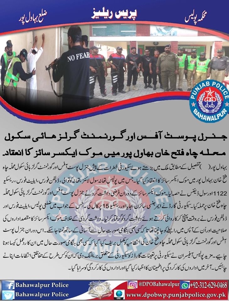ملک میں سکیورٹی خطرات کے پیش نظر بہاولپور پولیس کا گورنمنٹ گرلز ھائی اسکول چاہ فتح خان بہاولپور اور جنرل پوسٹ آفس بہاولپور پر موک ایکسرسائز کا انعقاد ۔