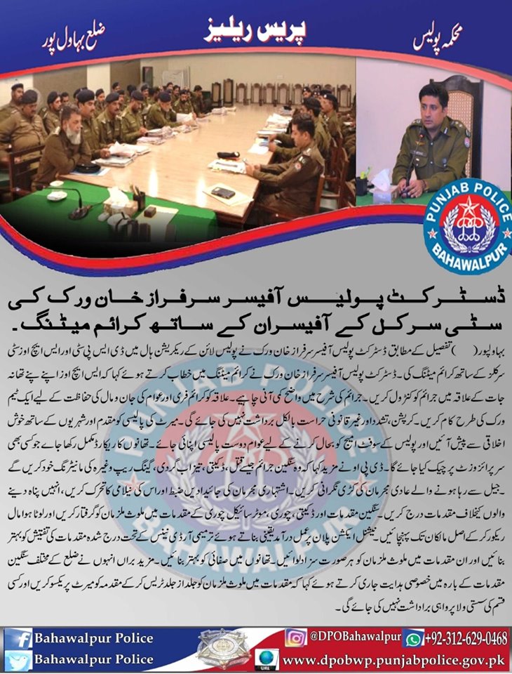 ڈسٹرکٹ پولیس آفیسر سرفراز خان ورک کی سٹی سرکل بہاولپور کے آفیسران کے ساتھ کرائم میٹنگ ۔